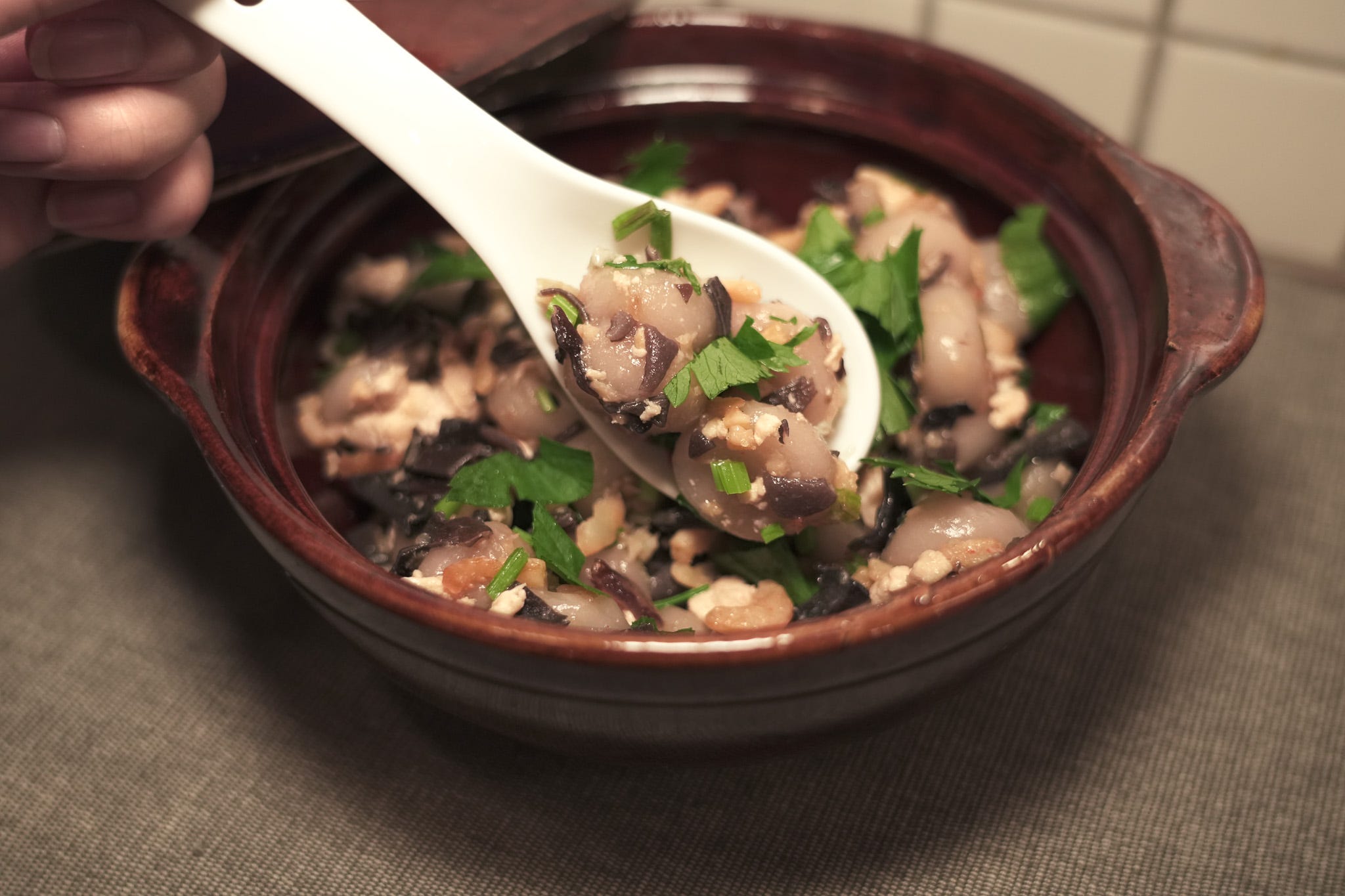 heat some oil in a frying pan over medium-high heat. stir-fry the garlic, black fungus, and haebee until fragrant. add the minced chicken and fry briefly, seasoning with a splash of soy sauce and oyster sauce. when the chicken is cooked through, add the abacus seeds and season with the remaining soy sauce and oyster sauce. add a splash of the haebee/ shiitake soaking water for extra flavour and moisture. finish with white pepper to taste, garnish, and serve!