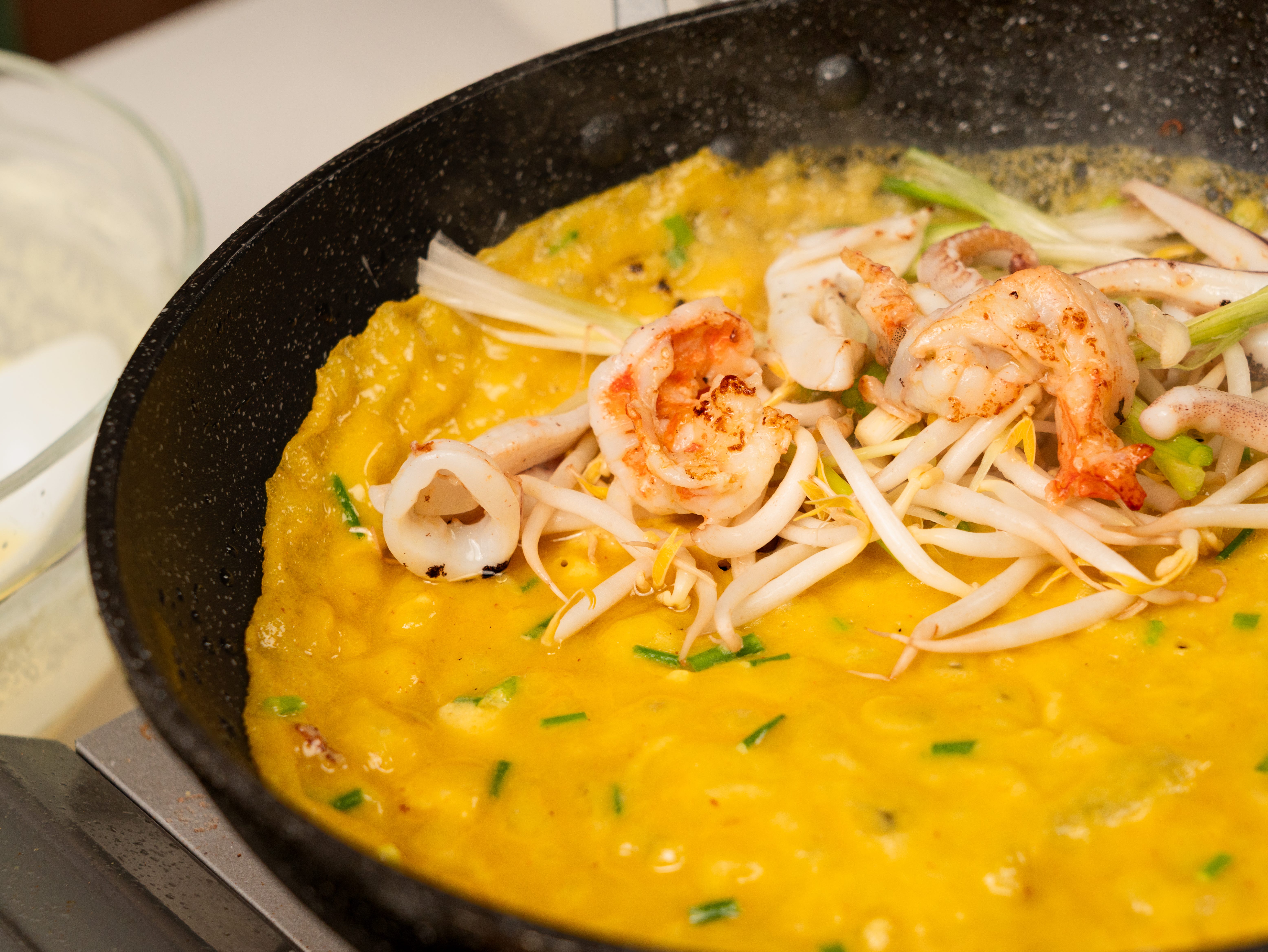 on one half of the crepe, add a few pieces of prawn and squid pieces, some beansprouts and the white parts of the spring onion.