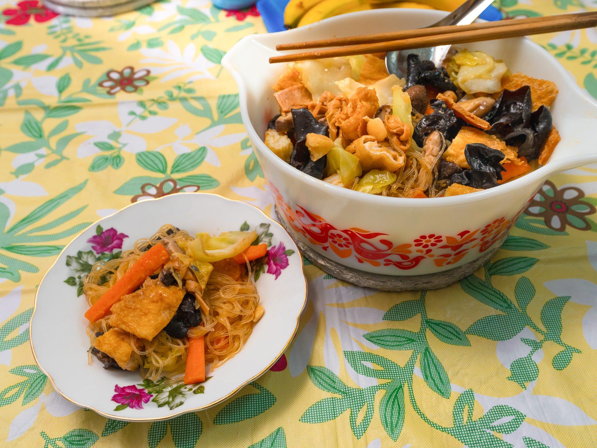 she still keeps some classic ingredients in the dish, like kim cham (dried lily buds), tau kee (dried beancurd strips), and glass noodles. beyond that, she mentions that it’s flexible, you can add your favourite vegetables, though staples like cabbage, mushrooms, and carrots are usually included.