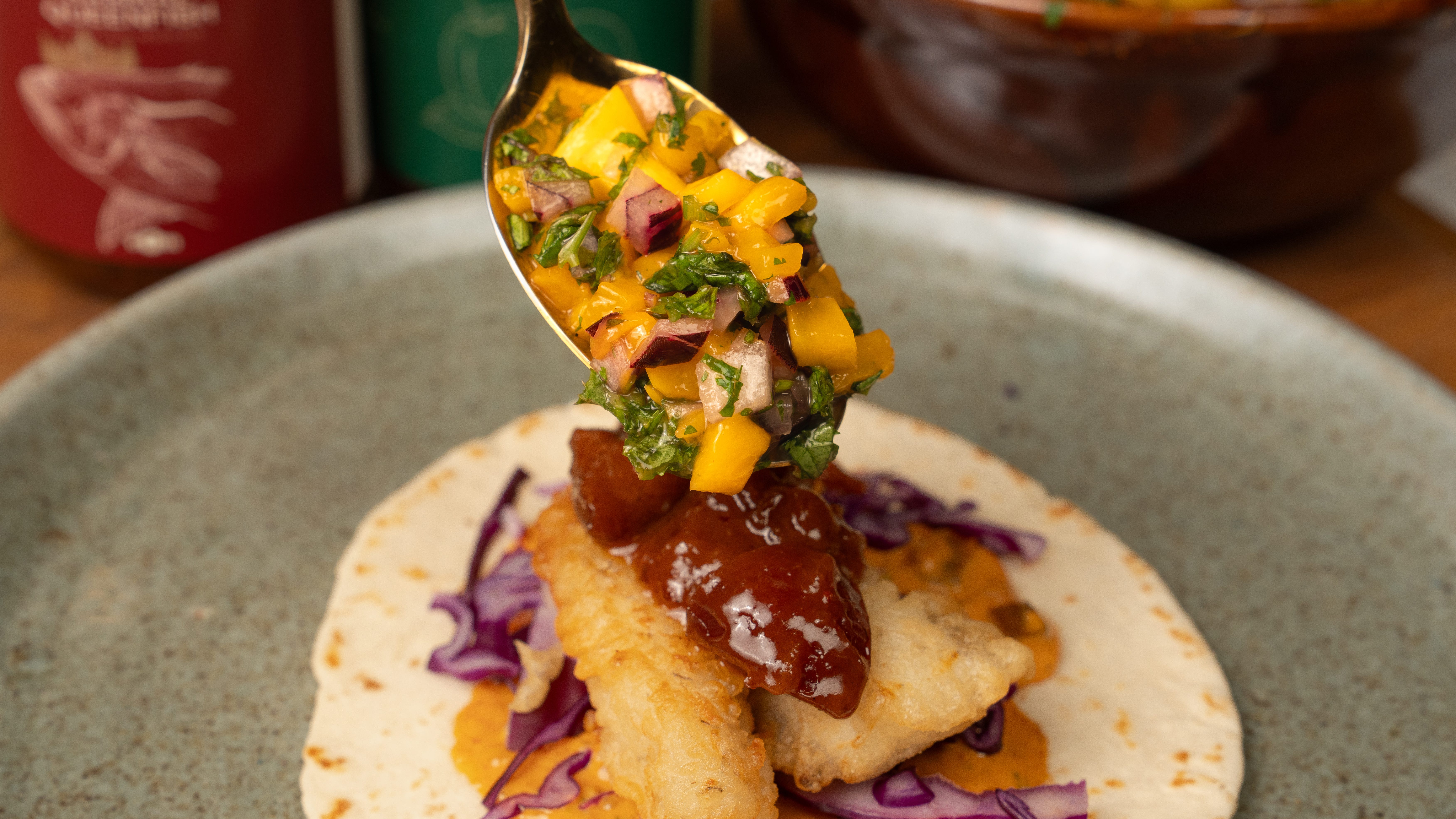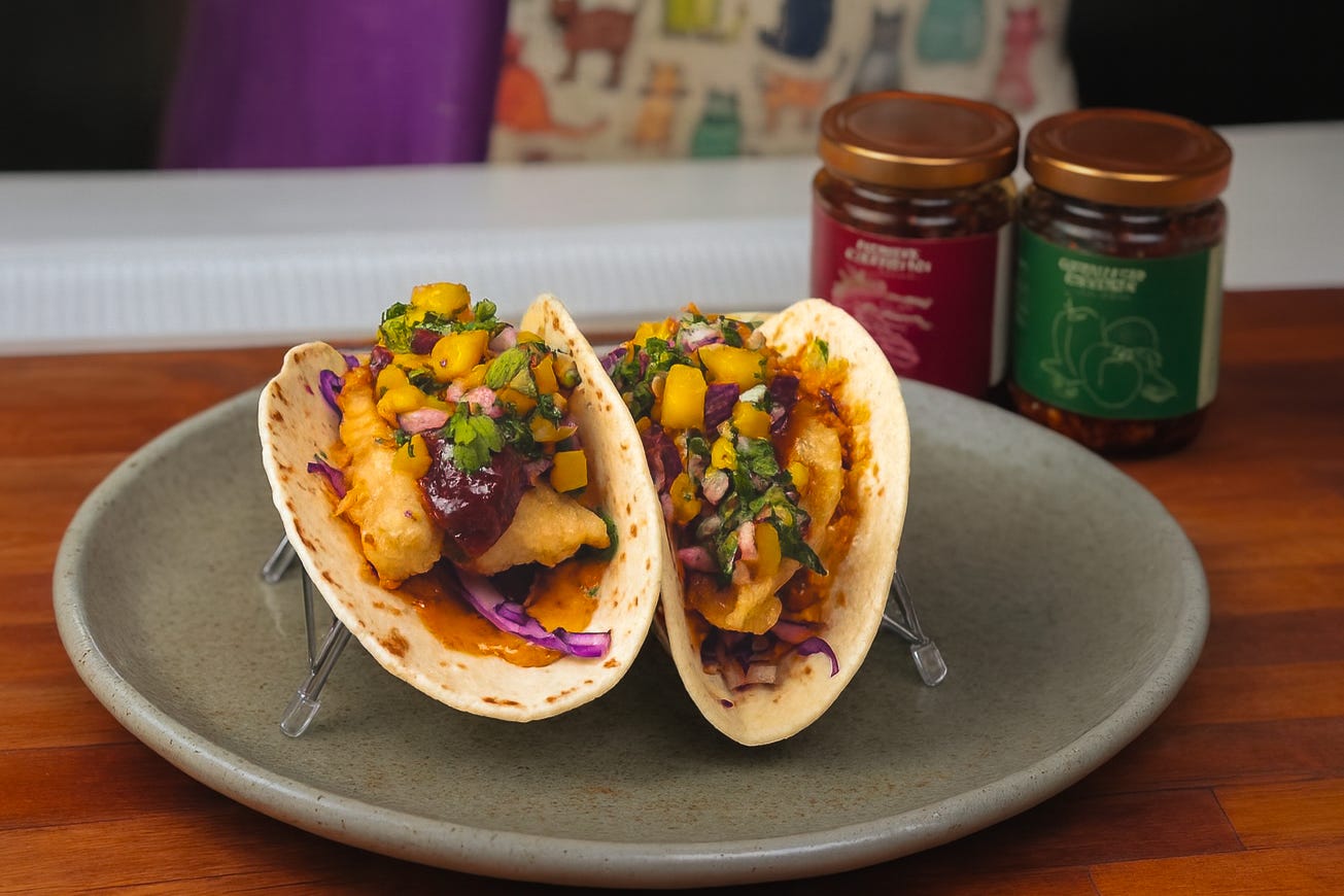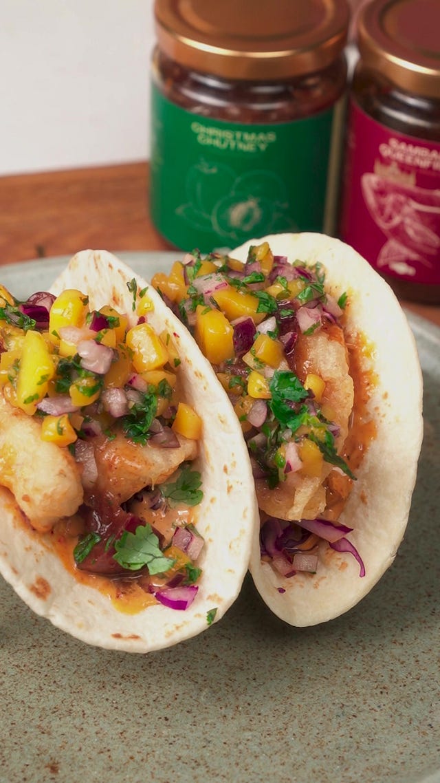 to assemble tacos, spread out a spoon of sambal mayo to a toasted tortilla. sprinkle some slices of shredded red cabbage, place a piece of crispy fish, spoon on half a tablespoon of nOm Christmas chutney followed by a generous dollop of mango salsa.