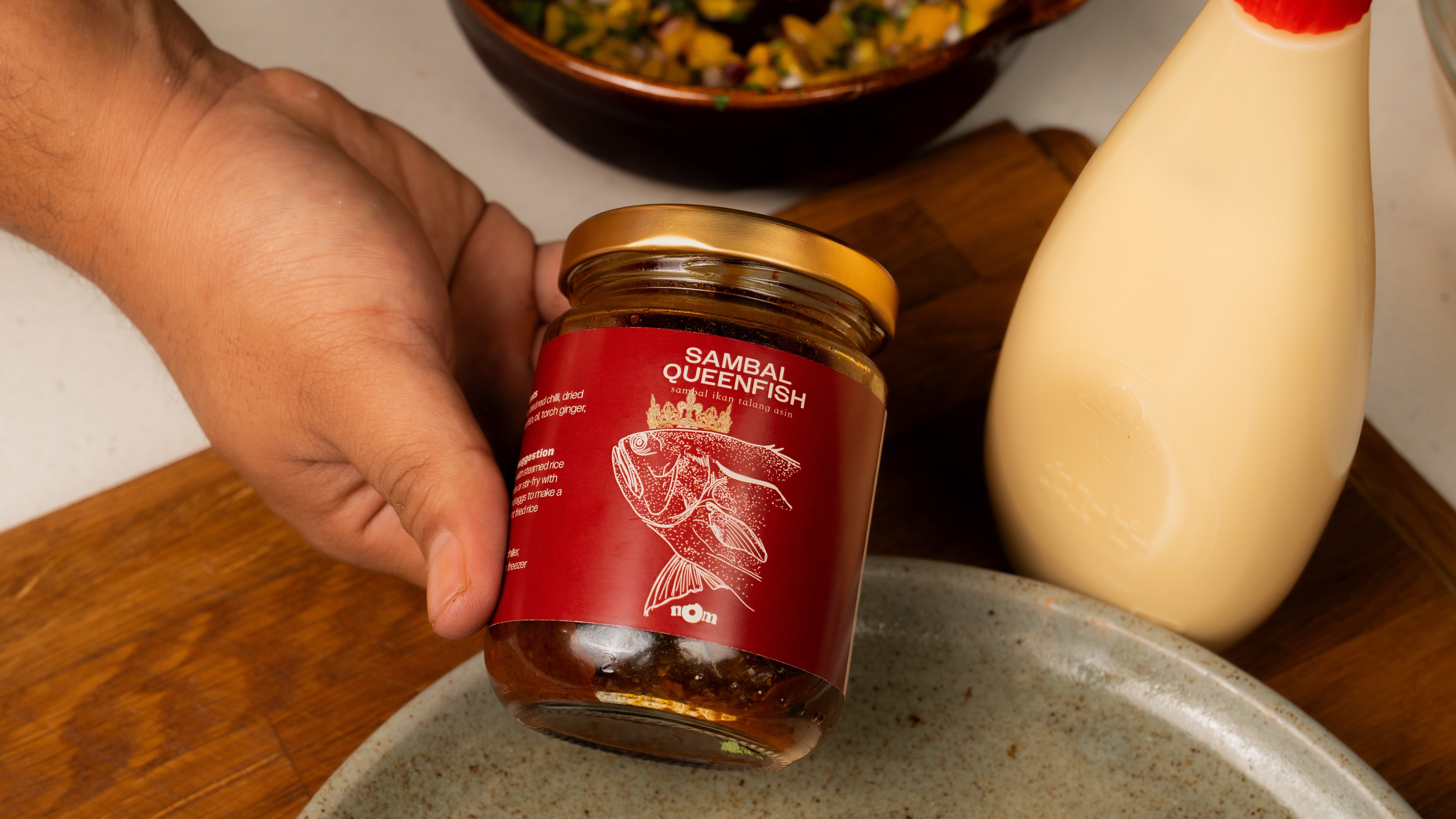 to make the sambal mayo, combine mayo and nOm Queenfish Sambal in a bowl an mix well.