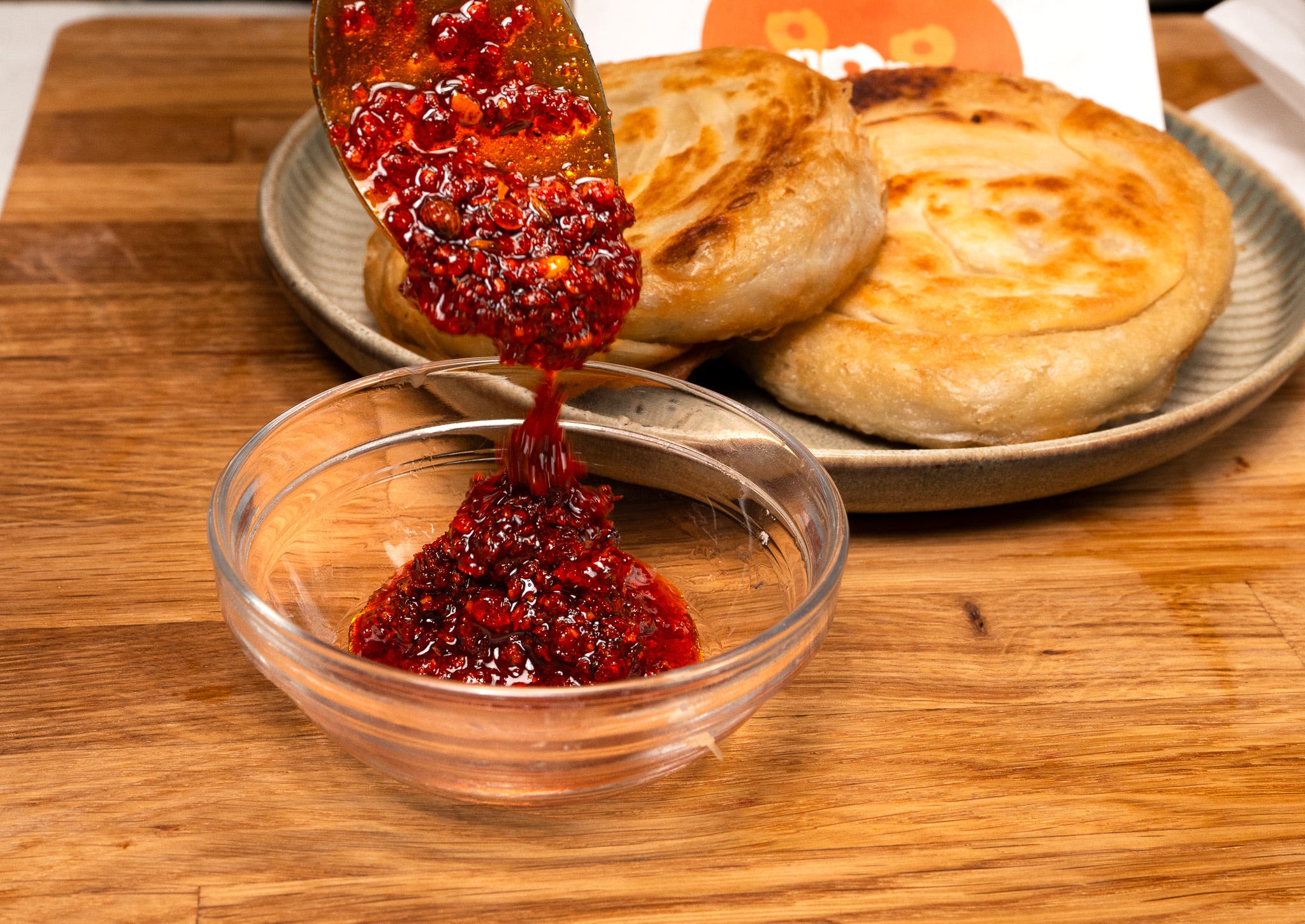 in a bowl combine chilli flakes, sugar, salt and MSG. pour the hot oil onto the mixture and let it sizzle for 10 seconds. then, stir the oil and ingredients evenly. the chilli oil can be kept in a bottle and eaten with the beef roti.