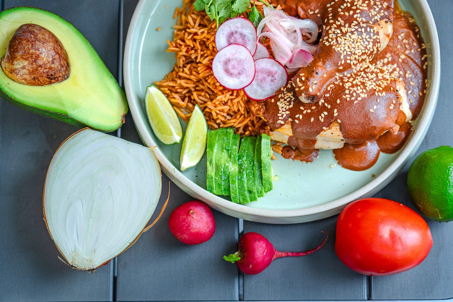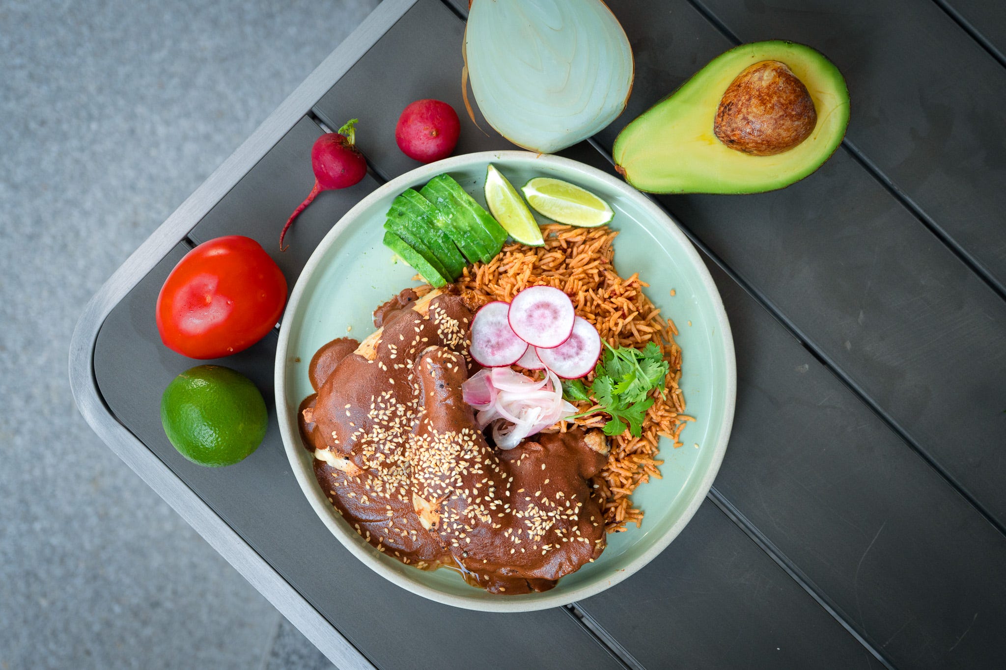 Spoon the sauce onto the cooked chicken and sprinkle sesame seeds. Serve alongside Mexican rice/ plain rice, sliced radish, lime, fresh avocado and garnish with coriander leaves.