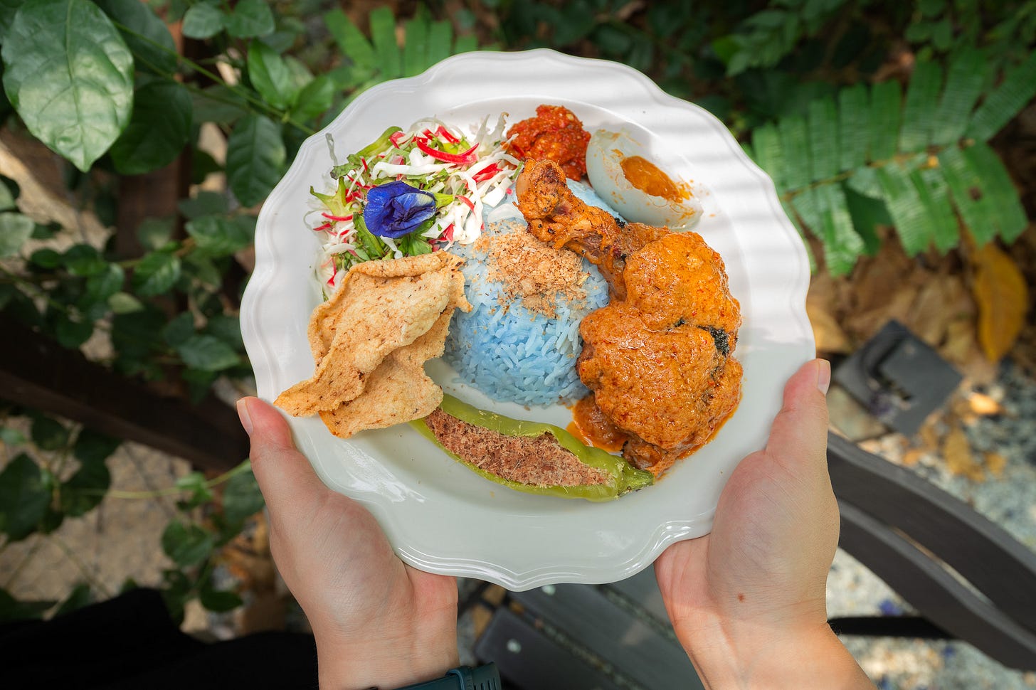 on the plate, scoop on the blue pea rice, arrange the grilled chicken leg & drizzle the percik sauce all over. spoon over the ‘kerabu’. add a piece of stuffed chilli, some fish crackers, sambal belachan and a half a salted duck egg. drizzle on 2 teaspoons of budu (fermented fish sauce) onto the rice (optional).