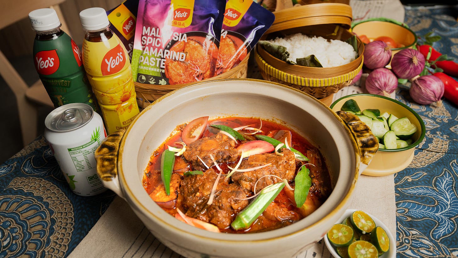 in a pot, heat oil on medium heat. sear the oxtail on all sides until a brown crust forms. then, pour in Yeo’s Malaysia Spicy Tamarind Paste and stir well.