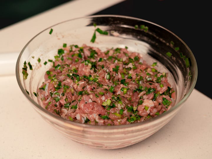 meanwhile, prepare the filling. combine chicken meat in a bowl with the sauces and salt. mix very using a a pair of chopsticks. mix in the sliced chives and until well combined. let the filling marinade for 20 minutes in the chiller.