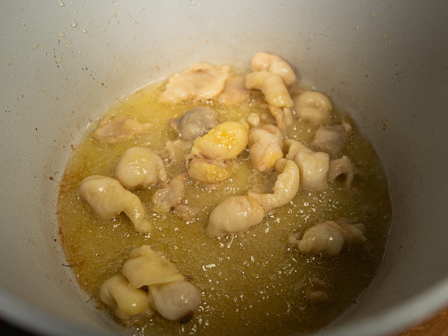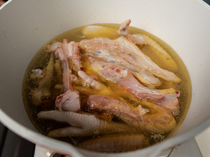 in a stockpot on medium heat, add the chicken fat pieces and let the oil render out fully until what is left is chicken solids and melted chicken grease. this may take about 15 to 20 minutes. using a spatula, fish out the solids and discard. to the fat, add the chicken bones and feet mix well until the bones start to brown.