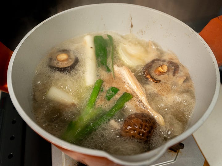 add water, leek, ginger, dried shiitake & konbu. bring the mixture to a rolling boil on high heat while skimming out the scum which floats on top. cover the broth and let it boil vigorously for 4 hours. then, decrease the heat to low and let the broth simmer gently for another 4 hours. top up with water when necessary.